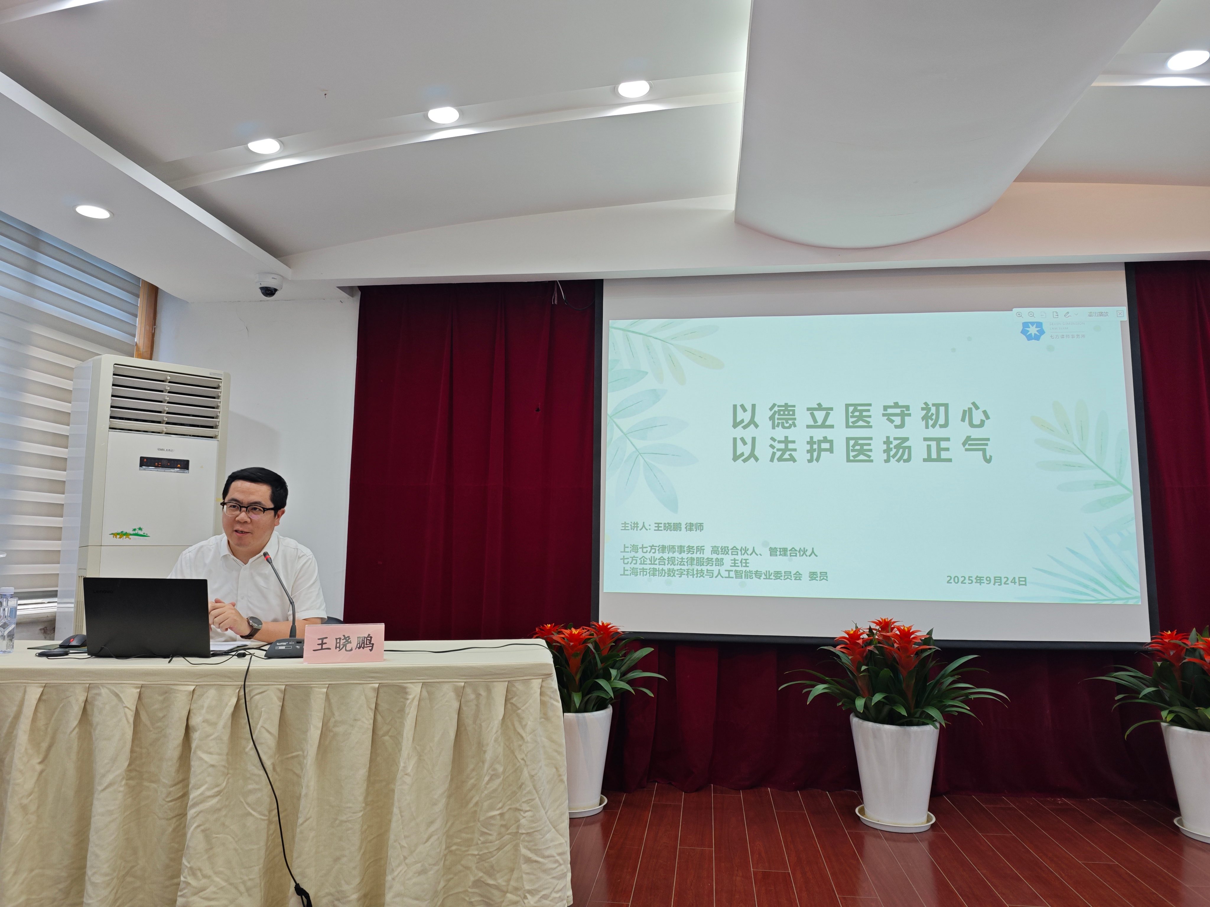 2025年9月25日,管理合伙人王晓鹏律师受邀前往静安区临汾街道社区卫生服务中心,为中心全体义务工作人员开展主题为“以德立医守初心,以法护医扬正气”的普法讲座,就加强医风医德建设相关法律问题与参加培训人员进行了专题讨论,讲座内容丰富、案例详实,获得了全体参训医务工作人员的一致好评。