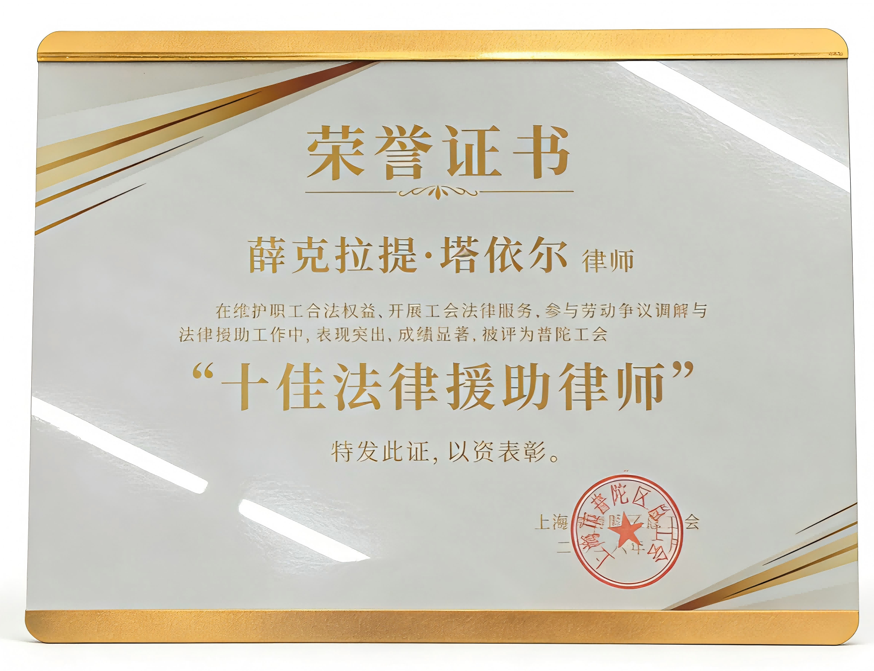 七方劳动法团队始终践行社会责任,在雪芹工作室积极开展法律服务,参与劳动争议调解与法律援助工作,用专业与耐心为职工排忧解难。凭借突出表现,李华平、谢亦团、李剑、王余婷、马怡坤、薛克拉提·塔依尔六名律师荣获普陀区总工会颁发的 “十佳法律援助律师”称号,这份荣誉是对团队与雪芹工作十年的陪伴与坚守最好的褒奖。