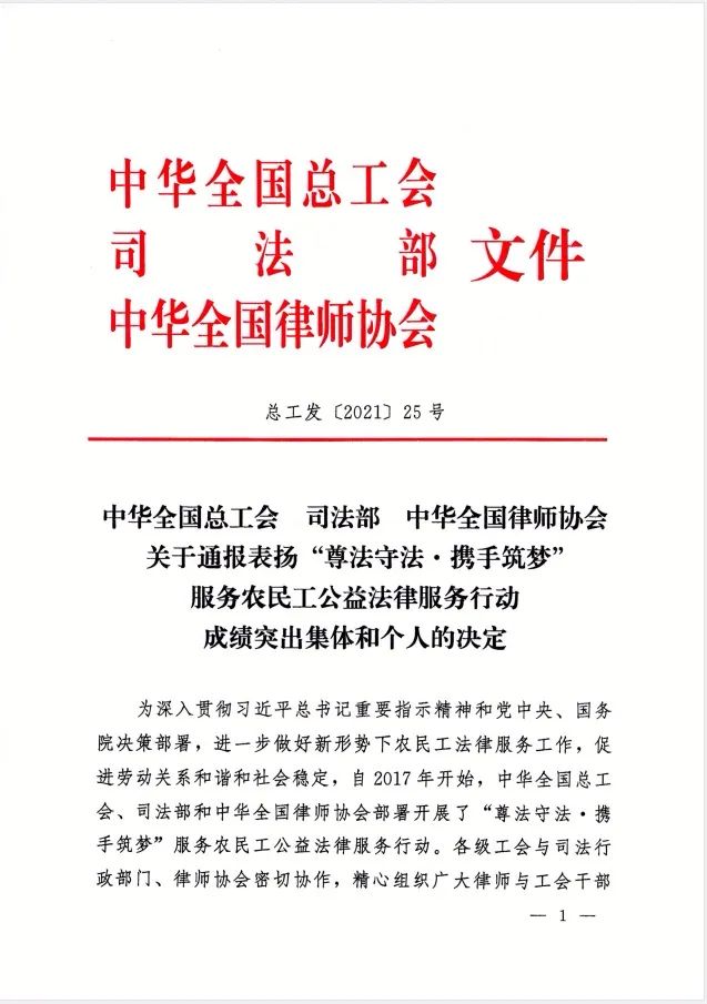 荣获全国总工会、司法部、全国律协通报表扬