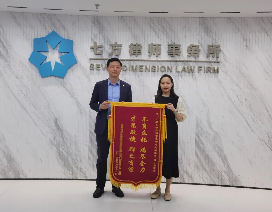 五一劳动节前夕,七方所副主任周松涛律师和合伙人吕小萌律师收到了南通某股份公司数十位职工股东集体赠送的一面锦旗,表达了他们对两位律师的感谢与敬意。